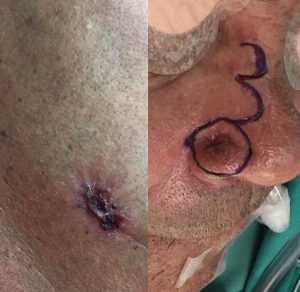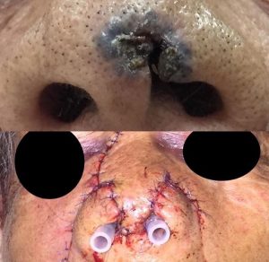 Cirugías resectiva de tumores faciales con reconstrucción mediante colgajos locales de piel, además realizamos biopsias de lesiones de piel sospechosas.